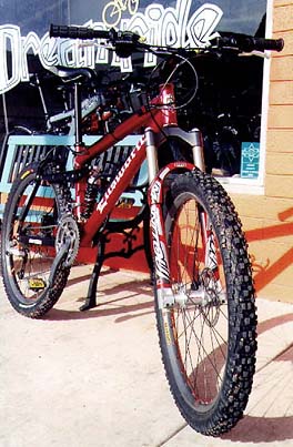 DREAMRIDE EDITION DARE 2000 DARE FRAME (Stratos Helix shock with lockout), Marzocchi MCR fork (5" travel), full Shimano XT, Hayes discs/Sun Rhino Lite or Mavic X317 rims/XT hubs, Chris King headset, Azonic World Force riser bar, Salsa Shaft or Thompson seatpost, Thompson stem, WTB SST kevlar sided saddle, WTB Motoraptor 2.4 kevlar beaded tires, Salsa Pepper grips, Salsa Ultralite tubes, Velox rim strips - $4875 -- built and shipped in its own hardshell flight case! Add $200 for Hayes hubs. SEE IT! SEE IT W/ RASTA CHRIS KING UPGRADE!